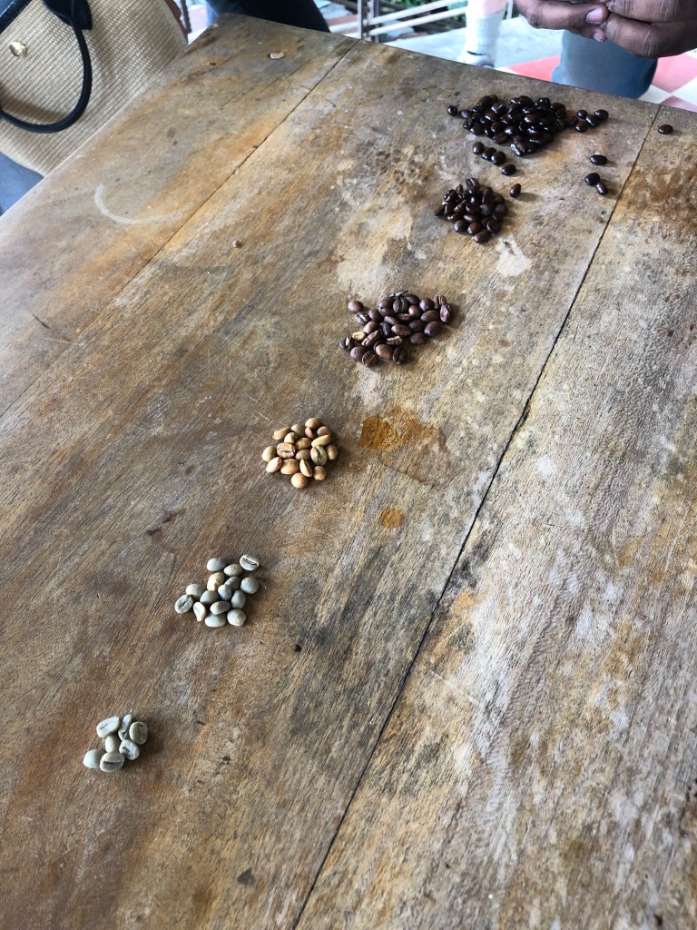 It did not seem right to visit Colombia without visiting the Zona Cafetera (the Coffee Axis), so we added a quick 2-day trip to the itinerary. Although the distance did not seem far, I knew that this might be a long drive so we splurged for a private driver from Medellin to the Hacienda Venecia near Manizales. We were picked up in Medellin at 9:30 and we were glad that we’d had a good breakfast because, once we cleared the outskirts of the city, there were not a lot of places to stop. The drive was very scenic as we drove through green mountains and fields of Avocado trees (a crop that is an expanding Colombian export). I kept waiting to see coffee and kept asking the driver “cafe?” as I pointed in distance. But he kept responding “aguacate”. It was not until we were very close to our destination that he smiled and pointed to a hill saying “cafe!”.