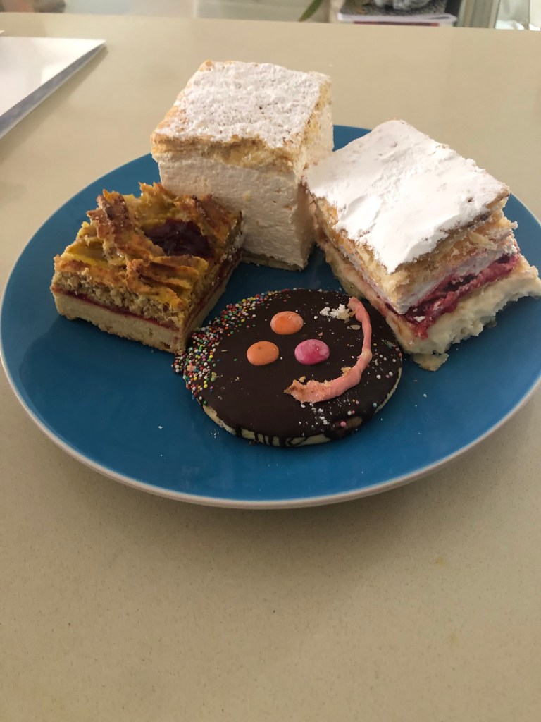 Day 2 was mine to plan and I wanted to visit St Kilda’s beach. We went to the famous Luna park where they have an old roller coaster that actually carries a “break person” on the ride to control it. I kind of regret that we did not ride it but $60 for the 4 of us seemed excessive at the time. We also explored the art market lining the street (Izzie bought us matching rings) and we walked along the pier. St Kilda’s is known for its cake shops so we each selected one and went home to enjoy them since the kids were still tired from the marathon day yesterday. I think that I won the cake competition with a classic raspberry vanilla custard.