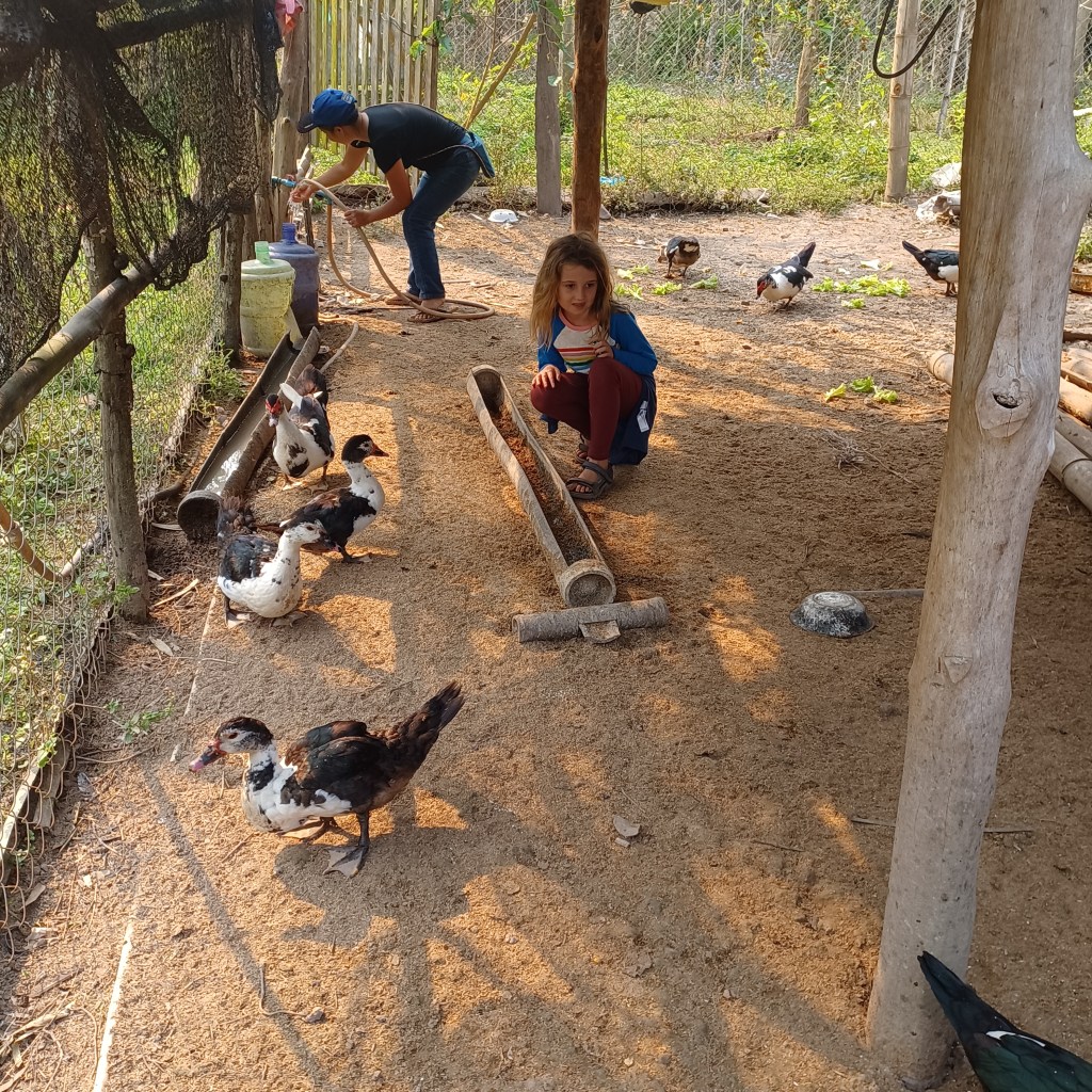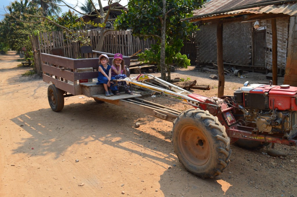 Kham’s uncle took us in his boat to watch the sunset. He also took us to ride on his Tak Tak (a soil tiller that pulls a wagon). Isabella says that it surpassed a Tuk Tuk as her new favourite form of transport. In addition to rice farming, the uncle raised animals, so the girls got to feed his ducks and chickens daily.